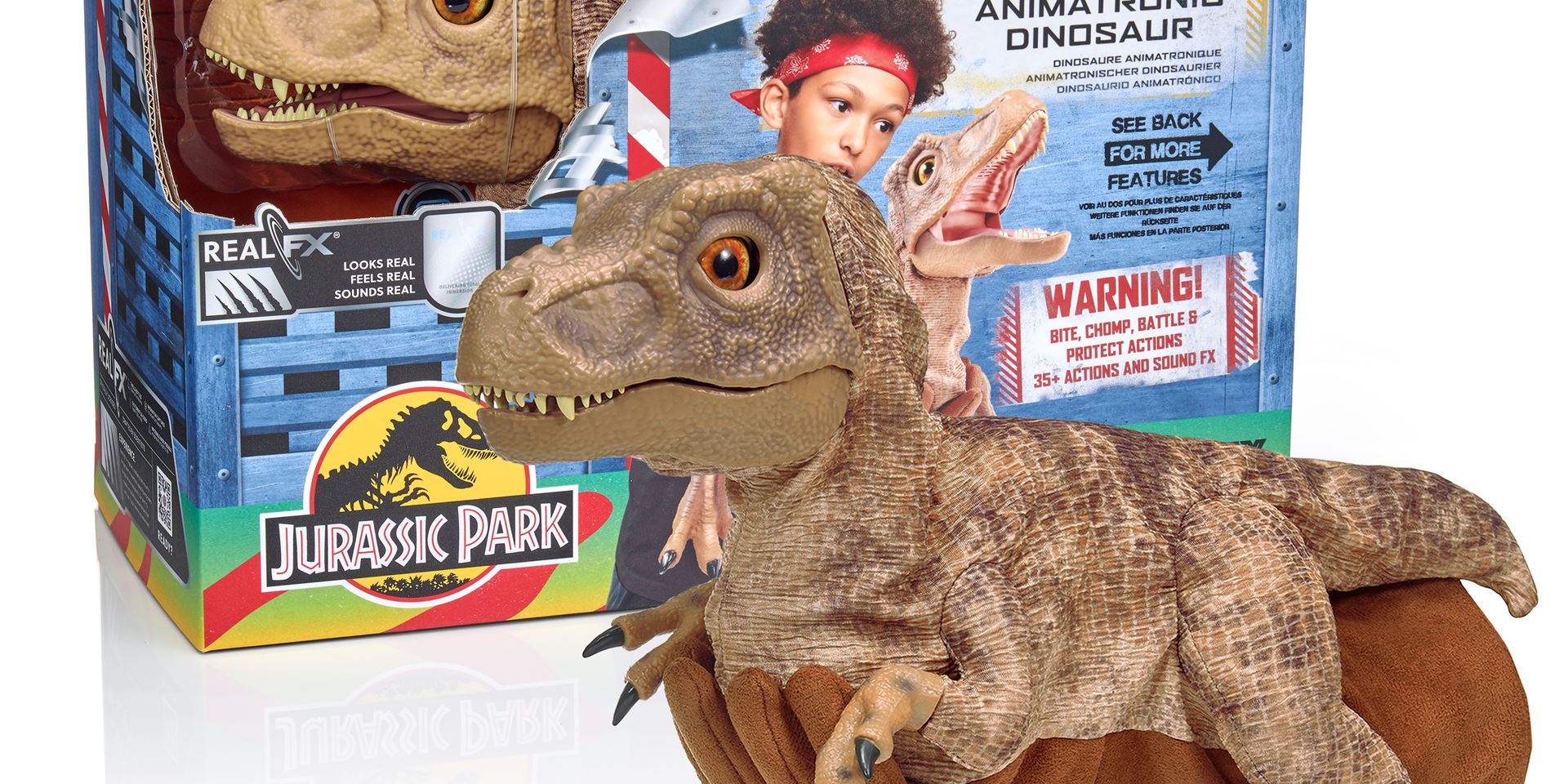 The brand-new Real FX Jurassic Park Baby T. rex celebrates the 30th Anniversary since Jurassic Park hit the big screen and is a hyper-realistic animatronic baby dinosaur operated by the user via an authentic faux leather park ranger’s handling glove. Real FX T. rex has more than 35 actions, touch sensors and sound effects from the movie, combined with life-like intuitive movements.