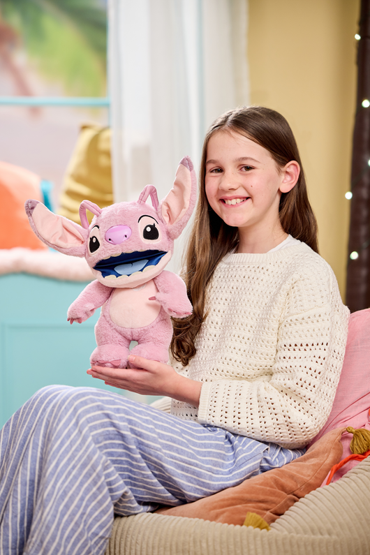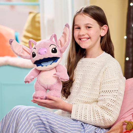 Introducing Disney Chatty Angel Deluxe Puppetronic from Disneys Lilo and Stitch, innovation from WOW! Stuff. The newest member of the Puppetronics range where puppetry and animatronics combine to bring Angel to life. With over 50 phrases and sound combinations hear Chatty Angel speak in her native tongue of Tantalog and hear her sing the famous Siren song. Watch as her mouth moves, and head turns, all while responding to your touch! With advanced lip sync technology, every phrase is triggered with Angel’s mouth movements adding an exciting layer to playtime. Packed full of play value you can showcase Angel's moods (loving or grumpy), using a simple press of one of 3 buttons located inside Angel's head. An easy to press third button allows you to trigger hero sounds from Angel, where she will sing her favourite Siren song associated with experiment 624. Our favourite loving aliens animatronic features combined with delightful puppetry create a captivating experience for kids and adults alike! Standing at nearly 30cm tall, Chatty Angel is the ideal size for hugs, cuddles, and endless imaginative adventures. Her soft and cuddly design makes her a cherished friend that kids will adore. Unlock unique special features and a whole new world of interaction when you pair Chatty Stitch with Chatty Angel (sold separately), they both share moods, will chat away to each other and fully interact like no other Puppetronic.