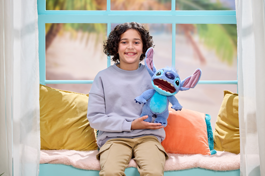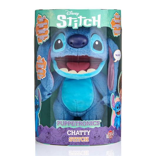 Introducing Disney Chatty Stitch Deluxe Puppetronic, innovation from WOW! Stuff. The newest member of the Puppetronics range where puppetry and animatronics combine to bring Stitch to life. With over 50 phrases and sound combinations hear Chatty Stitch speak in his native tongue of Tantalog with his charming alien voice. Watch as his mouth moves, and head turns, all while responding to your touch! With advanced lip sync technology, every phrase is triggered with Stitch’s mouth movements adding an exciting layer to playtime. Packed full of play value you can showcase Stitch's moods (mischevious or grumpy), using a simple press of one of 3 buttons located inside Stitch's head. An easy to press third button allows you to trigger hero sounds from Stitch, where he will speak some of the favourite sayings associated with experiment 626. Our favourite aliens animatronic features combined with delightful puppetry create a captivating experience for kids and adults alike! Standing at nearly 30cm tall, Chatty Stitch is the ideal size for hugs, cuddles, and endless imaginative adventures. His soft and cuddly design makes him a cherished friend that kids will adore. Unlock unique special features and a whole new world of interaction when you pair Chatty Stitch with Chatty Angel (sold separately), they both share moods, will chat away to each other and fully interact like no other Puppetronic.