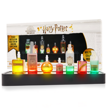 Harry Potter Potion Bottles Mood Lamp from Wow! Stuff. Illuminate your room with this mood light and become a Wizarding World potions master! Place all potion bottles onto the tray then press the discreet button to activate this amazing multi-colour light show. Each potion bottle is inspired by the potion bottles in Serverus Snape’s potion room cupboard. Multi-colour lighting Powered by batteries. The potion tray can be placed on a shelf, desk or other flat surface. Uses 3x AAA batteries (not included. Nor are snake fangs, Billywig stings or sprigs of wolfsbane)