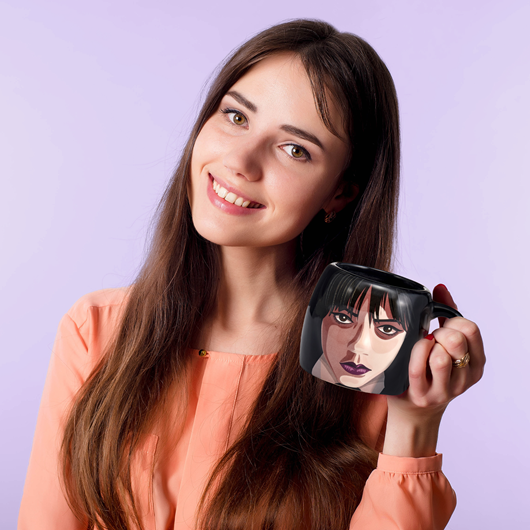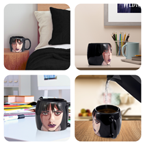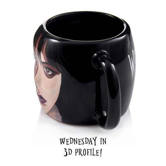 - WEDNESDAY THEMED MUG Beautifully crafted and decorated 3D Wednesday face in profile on the mug. Wednesday Addams on the front and surprise Thing hiding inside!