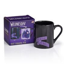 - WEDNESDAY THEMED MUG - Pour in your hot drink, coffee, tea or hot chocolate to see this official Wednesday Addams mug change colour to reveal the Nevermore Academy School from the hit Netflix series Wednesday
