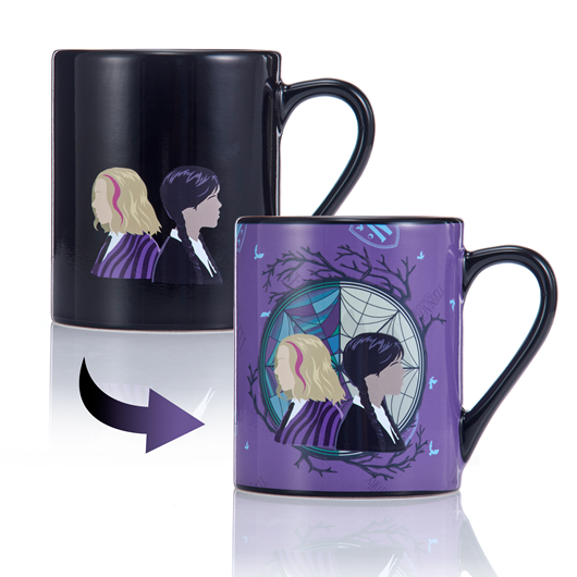 - WEDNESDAY THEMED MUG - Pour in your hot drink to reveal an image! Reveals the iconic Stained Glass Spiderweb Window from the hit Netflix series Wednesday behind the sombre Wednesday and her bubbly best friend Enid the Werewolf!