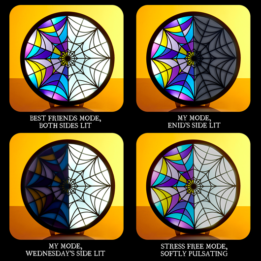 - MULTI-LIGHT MODES Use the secret button to scroll through 4 light modes. 1. Illuminate either Enid's side or 2. Wednesday's side of the window 3. Illuminate both sides. 4. Softly pulsating light across both side's, Enid's and Wednesday's!